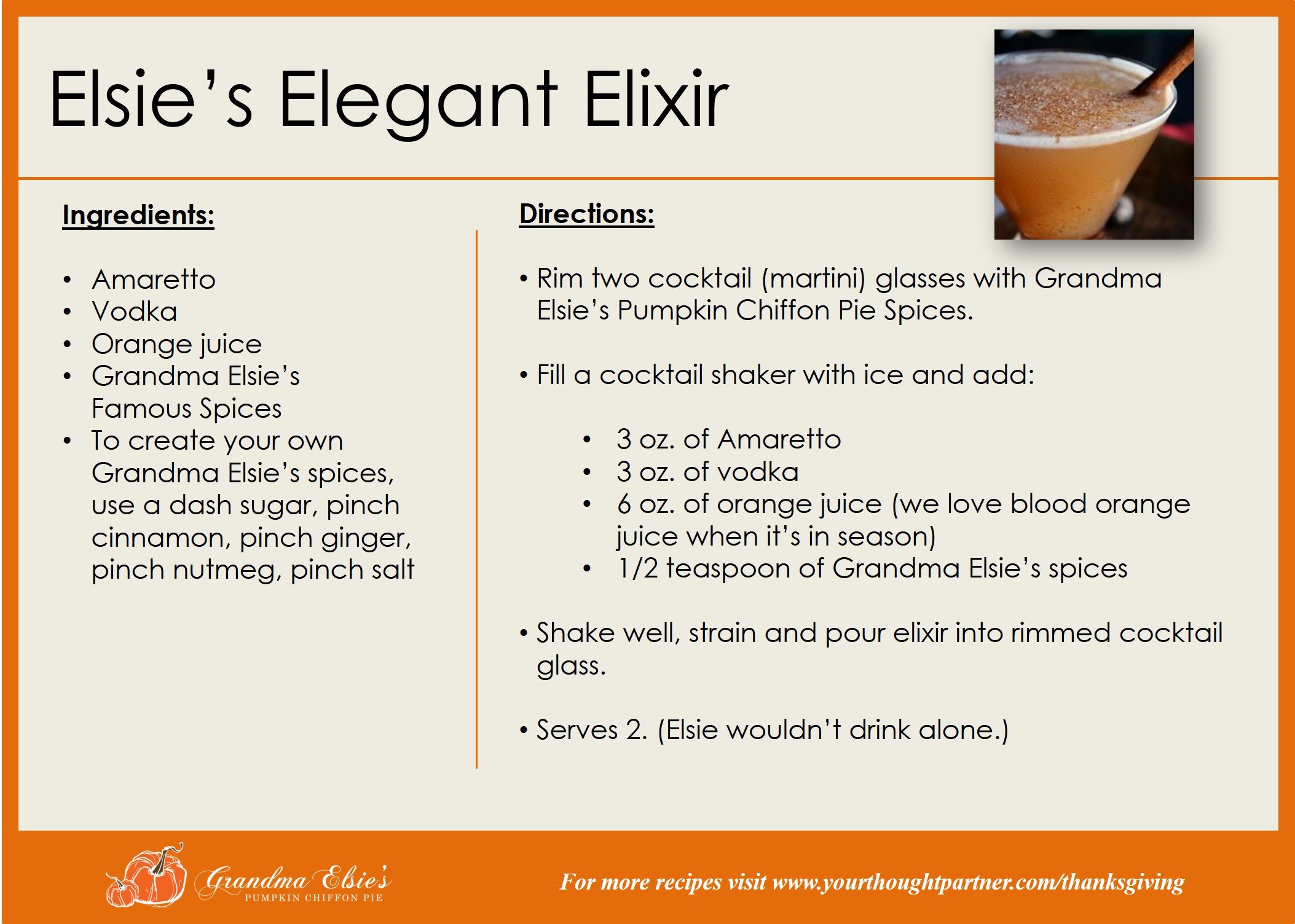 As we all continue to celebrate the season of giving, we want to share another one of Grandma Elsie’s famous recipes with you. This time: Elsie’s Elegant Elixir! Toast to the season and the spirit of Grandma Elsie with this delicious cocktail.