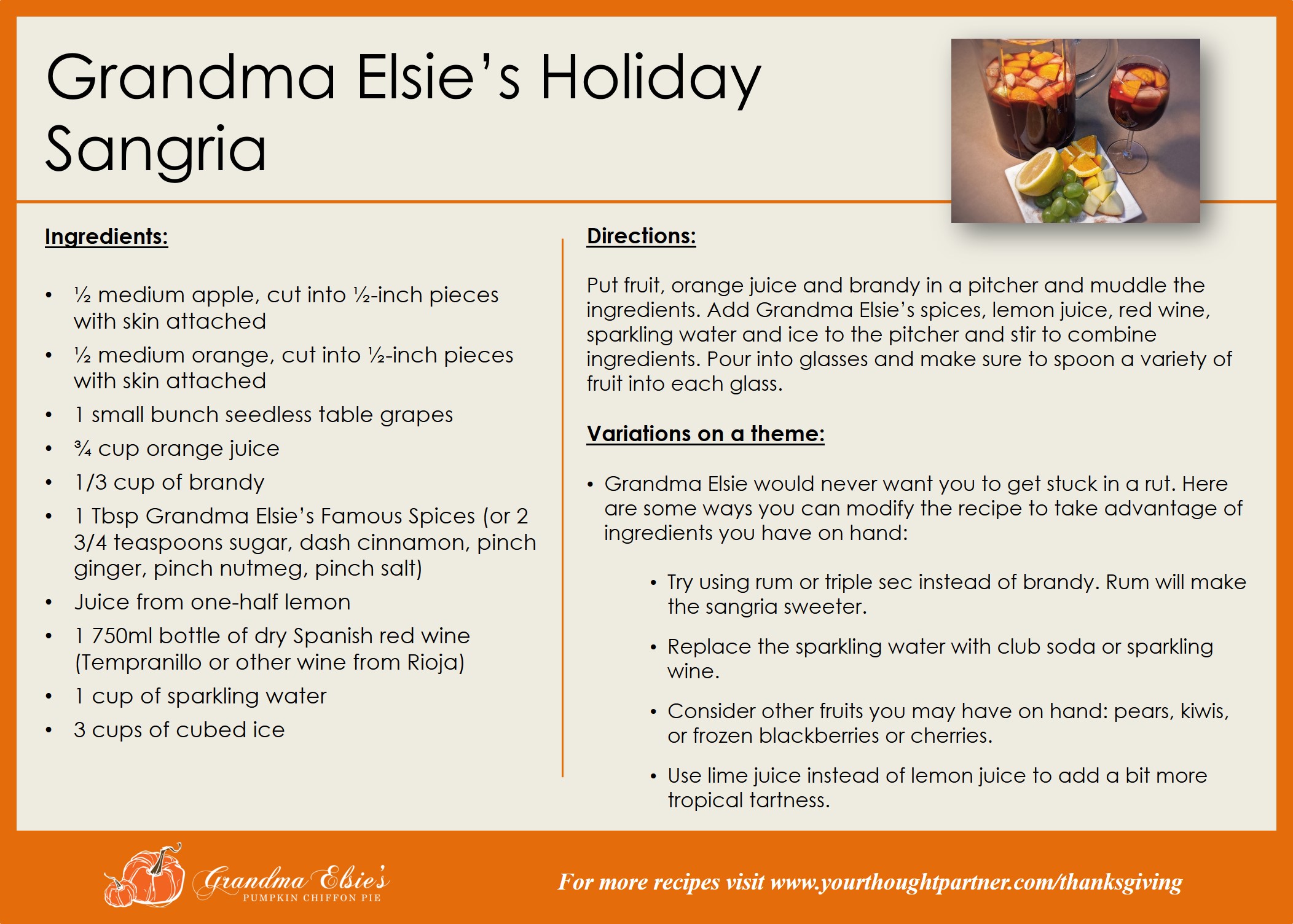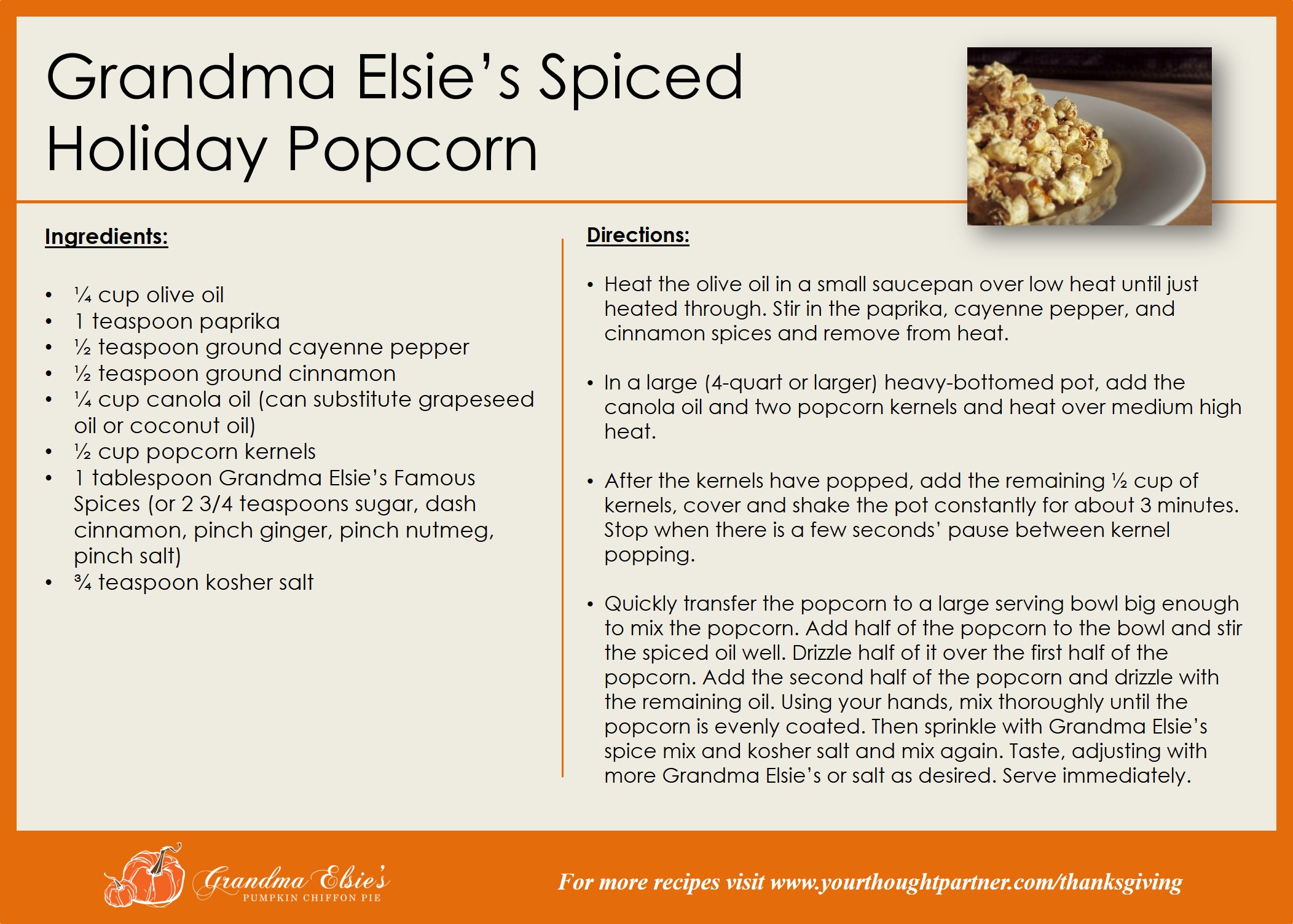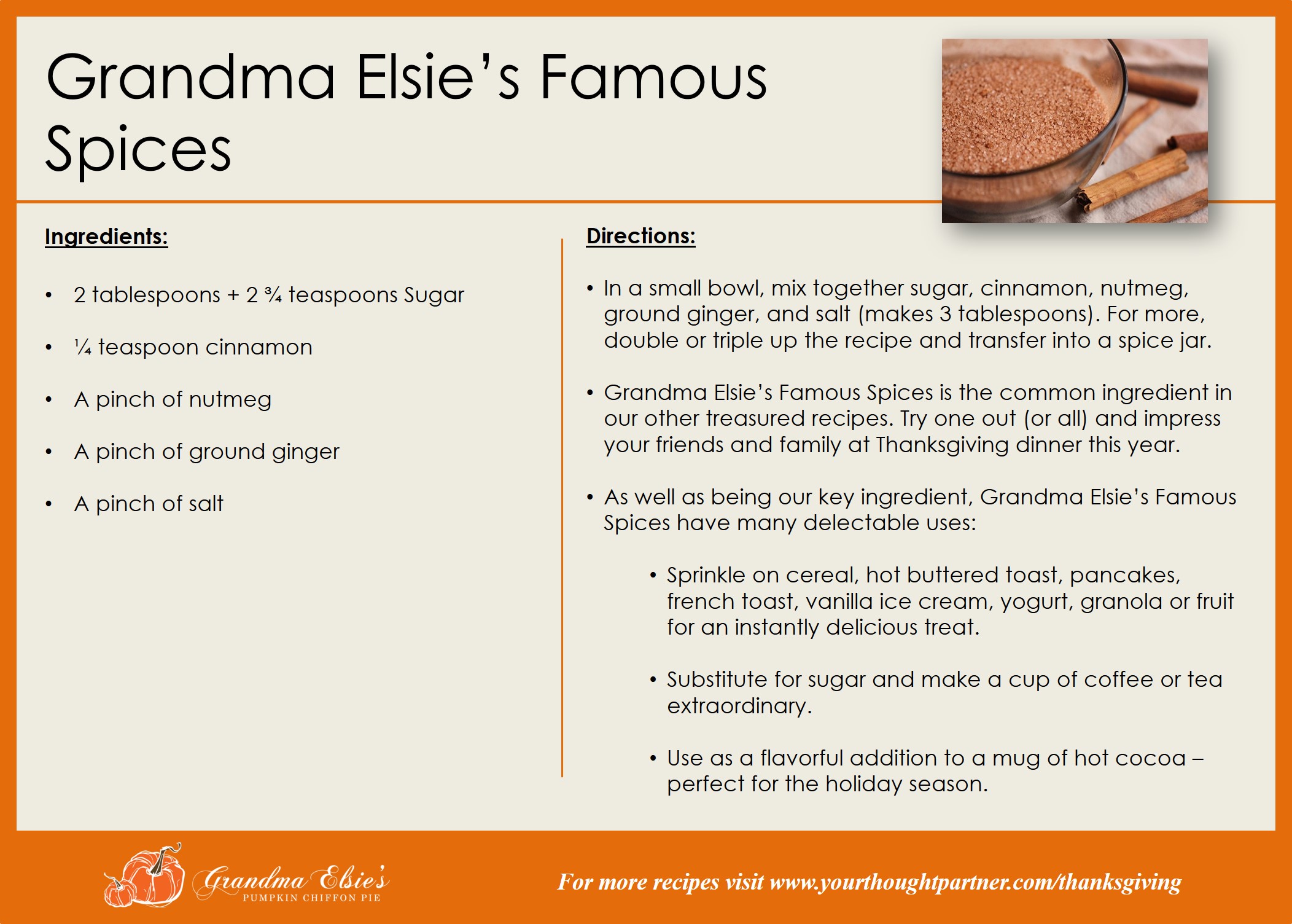 Over time, Grandma Elsie has come to be known for many delicious Thanksgiving inspired recipes using her famous spices, which we have collected and placed into a convenient recipe book for all to enjoy.